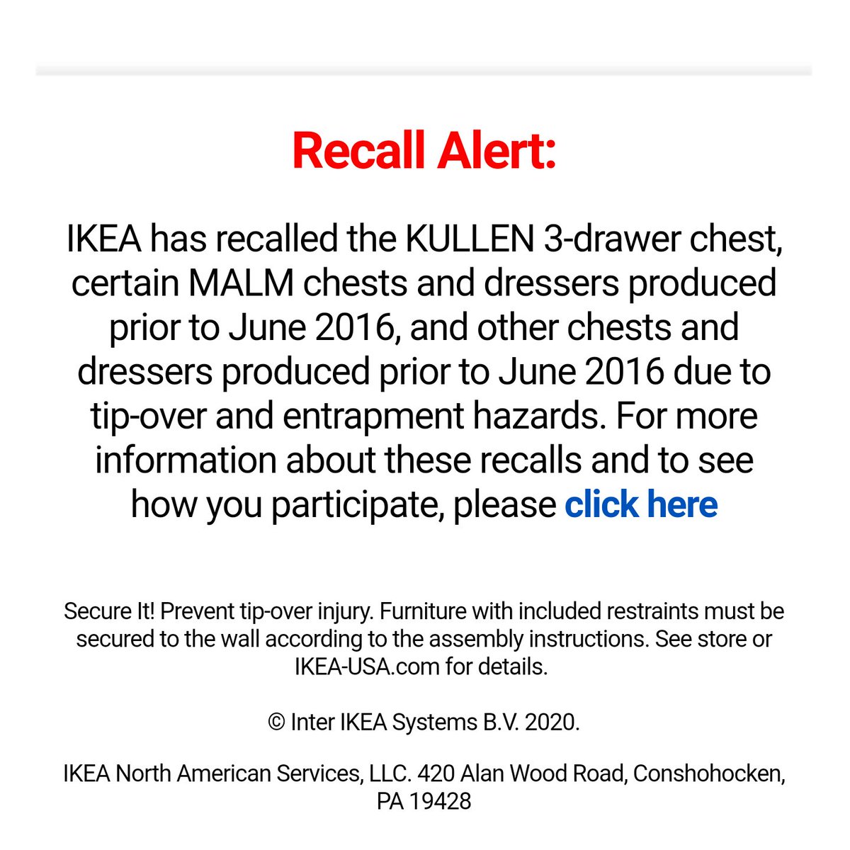 Dangerous ikea dressers recalled over risk of crashing onto children.